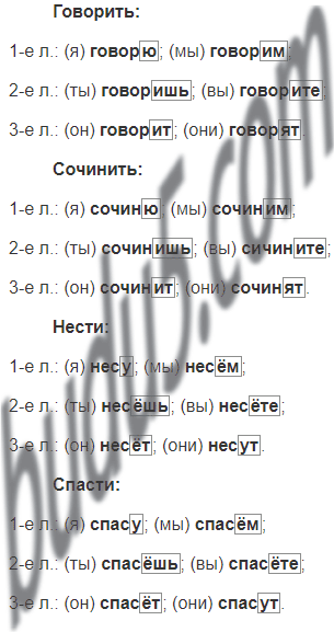 Измени по лицам и числам в настоящем или будущем времени глаголы говорить, сочинить, нести, спасти. Проверь, подчиняются ли такой же закономерности другие глаголы. Выдели личные окончания глаголов.