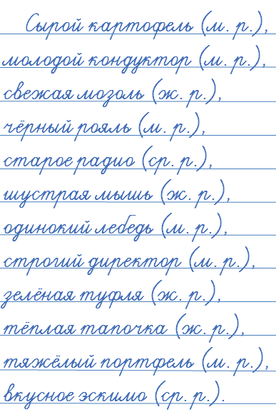 Жареный картофель (м. р.), пожилой кондуктор (м. р.), больная мозоль (ж. р.), старинный рояль (м. р.), громкое радио (ср. р.), шустрая мышь (ж. р.), чёрный лебедь (м. р.), строгий директор (м. р.), модная туфля (ж. р.), домашняя тапочка (ж. р.), школьный портфель (м. р.), шоколадное эскимо (ср. р.).