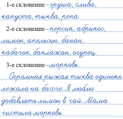 Составьте по одному предложению с существительным каждого из склонений и запишите.