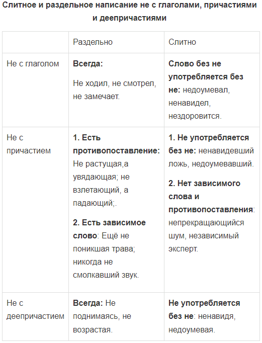 Составьте таблицу «Слитное и раздельное написание не с глаголами, причастиями и деепричастиями»; в её левой части по вертикали поместите глаголы, причастия и деепричастия, а в правой по горизонтали отразите способ написания не (слитно или раздельно). Заполните таблицу четырьмя примерами, обозначая в них условия выбора раздельного или слитного написания не.