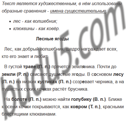 В густой (трава) прячется земл..ника. Почти до (земля) свисают душ..стые яг..ды. В с..сновом (лес) на низких (кустики) созр..вает черника, а на пушистых сухих коч..ках растёт брусника.