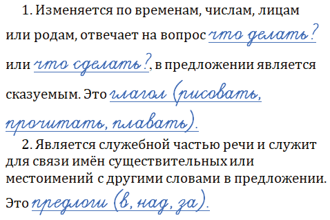1. Изменяется по временам, числам, лицам или родам, отвечает на вопрос что делать? или что сделать?, в предложении является сказуемым. Это глагол (рисовать, прочитать, плавать).
