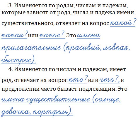 3 Изменяется по родам, числам и падежам, которые зависят от рода, числа и падежа имени существительного, отвечает на вопрос какой? какая? или какое?. Это имена прилагательные (красивый, ловкая, быстрое).