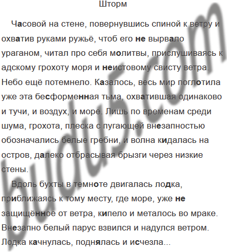 Ч..совой на стене повернувшись спиной к ветру и охв..тив руками ружьё, чтоб его (не) вырв..ло ураганом, читал про себя м..литвы прислушиваясь к адскому грохоту моря и (не) истовому свисту ветра. Небо ещё потемнело. К..залось, весь мир погл..тила уже эта бе..форме(н, нн)ая тьма охв..тившая одинаково и тучи и воздух и море. Лишь по временам среди шума грохота плеска с пугающей вн..запностью обозначались белые гребни и волна к..далась на остров д..леко отбрасывая брызги через низкие стены.