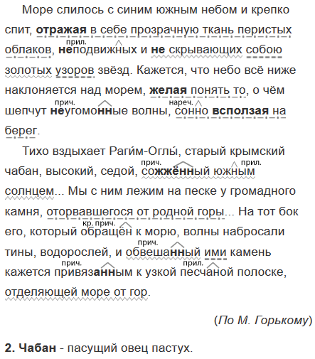 Тихо вздыхает Раги́м-Оглы́, старый крымский чабан, высокий, седой, со(ж, жж)..(н, нн)ый южным солнцем... Мы с ним лежим на песке у громадного камня оторвавшегося от родной горы... На тот бок его который обращён к морю волны набросали тины, водорослей, и обвеша(н, нн)ый ими камень кажется привяз..(н, нн)ым к узкой песча(н, нн)ой полоске отделяющей море от гор.