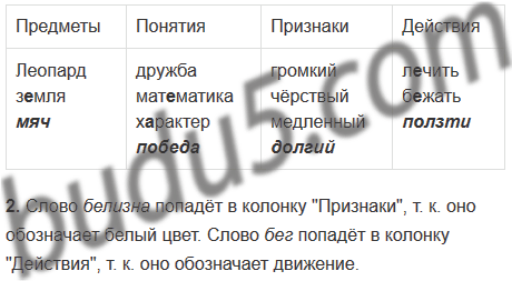 Заполните таблицу. Определите, какие из данных слов обозначают предметы, какие — понятия, какие — признаки, какие — действия.