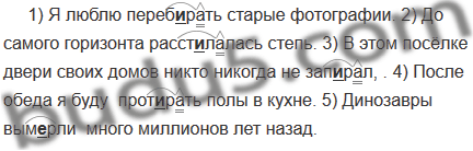 1) Я люблю (переб..рать, переб..ру) старые фотографии. 2) До самого горизонта (расст..лалась, расст..лилась) степь. 3) В этом посёлке двери своих домов никто никогда не (зап..рал, зап..р). 4) После обеда я буду (прот..реть, прот..рать) полы в кухне. 5) Динозавры (вым..рли, вым..рали) много миллионов лет назад.