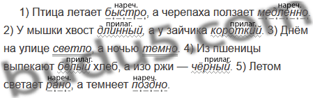 1) Птица летает (...), а черепаха ползает (...). 2) У мышки хвост (...), а У зайчика (...) . 3) Днём на улице (...), а ночью (...). 4) Из пшеницы выпекают (...) хлеб, а изо ржи — (...). 5) Летом светает (...), а темнеет.