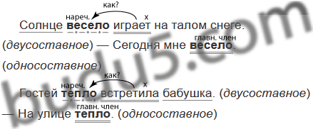 Сравните пары предложений. Какие из них являются двусоставными, какие — односоставными? В каких предложениях выделенные слова обозначают признак действия, поясняют глаголы и являются обстоятельствами, в каких — обозначают эмоциональное состояние человека, состояние окружающей среды и являются главным членом односоставного предложения?