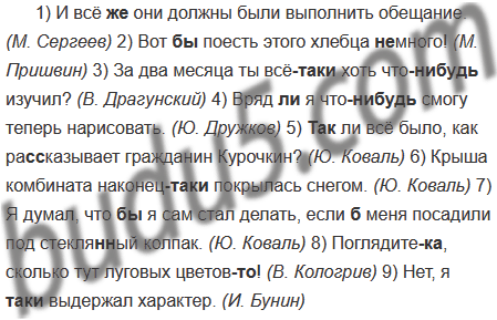 1) И всё(же) они должны были выполнить обещание. (М. Сергеев) 2) Вот(бы) поесть этого хлебца (не)много! (М. Пришвин) 3) За два месяца ты всё(таки) хоть что(-нибудь) изучил? (В. Драгунский) 4) Вряд(ли) я что(нибудЬ) смогу теперь нарисовать. (Ю. Дружков) 5) (Так)ли всё было, как ра(с,сс)казывает гражданин Курочкин? (Ю. Коваль) 6) Крыша комбината наконец(таки) покрылась снегом. (Ю. Коваль) 7) Я думал, что(бы) я сам стал делать, если(б) меня посадили под стекля(н, нн)ый колпак. (Ю. Коваль) 8) Поглядите(ка), сколько тут луговых цветов(то)! (В. Кологрив) 9) Нет, я(таки) выдержал характер. (И. Бунин)