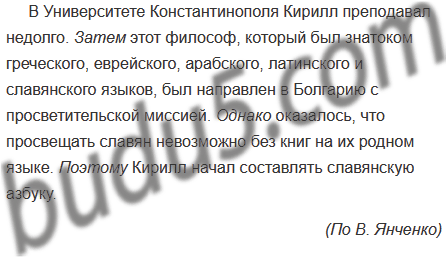В Университете Константинополя Кирилл преподавал недолго. (...) этот философ, который был знатоком греческого, еврейского, арабского, латинского и славянского языков, был направлен в Болгарию с просветительской миссией. (...) оказалось, что просвещать славян невозможно без книг на их родном языке. (...) Кирилл начал составлять славянскую азбуку.