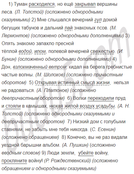 1) Туман расходился но ещё закрывал вершины леса. (Л. Толстой) 2) Мне слышался вечерний гул домой бегущих табунов и дальний лай знакомых псов. (М. Лермонтов) 3) Опять знакомо запахло пресной тёплой водой илом полевой вечерней свежестью. (И. Бунин) 4) Дон взлохмаченный ветром кидал на берега гребнистые частые волны. (М. Шолохов) 5) Открывая истинный смысл жизни нельзя не радоваться. (А. Платонов) 6) Волки переходили пруд и стояли в камышах нюхая жилой воздух усадьбы. (А. Н. Толстой) 7) Низкий дом с голубыми ставнями не забыть мне тебя никогда. (С. Есенин) 8) Конечно, вы не раз видали уездной барышни альбом. (А. Пушкин) 9) Люди земли убейте войну прокляните войну! (Р. Рождественский)