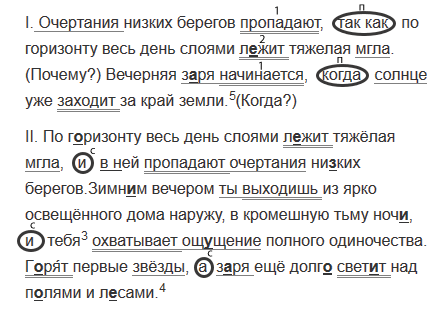 1. По горизонту весь день слоями л..жит тяжёлая мгла и (в)ней пропадают очертания ни..ких берегов. 2. Очертания низких берегов пропадают так как по горизонту весь день слоями л..жит тяжелая мгла. 3. Зимн..м вечером ты выходишь из ярко освещённого дома наружу, в кромешную тьму ноч.. и тебя3 охватывает ощ..щение полного одиночества. 4. Вечерняя з..ря начинается когда солнце уже заходит за край земли.5 5. Г..рят первые звёзды а з..ря ещё долго свет..т над полями и лесами.4