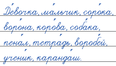 С..рока‚ в..робей, в..рона‚ к..рова‚ с..бака, уч..ник‚ дев..чка‚ п..нал‚ к..р..ндаш‚ т..традь‚ мальч..к.