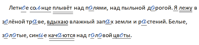 Летн_е со_нце плывёт над п_лями над пыльной д_рогой. Я лежу в з_лёной тр_ве вдыхаю влажный зап_х земли и р_стений. Белые з_л_тые син_е кач_ются над г_л_вой цв_ты. (И. Соколов-Микитов)