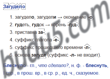 Не забудь разобрать по составу слово загудело2 (помни, что суффикс -л- не входит в основу слова), а глагол блеснуло3 как часть речи.