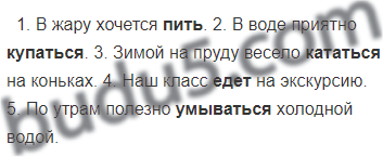1. В жару хочется ... . 2. В воде приятно ... . 3. Зимой на пруду весело ... на коньках. 4. Наш класс ... на экскурсию. 5. По утрам полезно ... холодной водой.