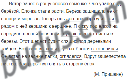 Ветер занёс в рощу еловое семечко. Оно упало под берёзой. Ёлочка стала расти. Берёза защищала её от солнца и морозов.Теперь ель догнала берёзу и стоит рядом с ней вершина к вершине. Я сижу под ёлкой на середине лесной поляны и слушаю шелест листьев берёзы. Этот шелест будит спящих под деревьями зайцев. Вот заяц вышел из густых ёлок и остановился. Он встал на задние лапки, огляделся. Вдруг зашелестела листва. Заяц прыгнул опять в сторону ёлок.
